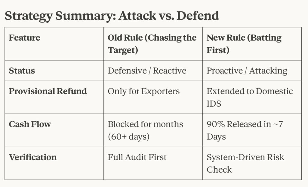 In business, the same truth applies. For years, domestic manufacturers were reactive by design — the law forced them into a defensive crouch, chasing refunds and protecting cash flow instead of deploying it. This amendment puts them on the front foot. It lets you plan your quarterly cash flows with confidence, knowing that 90% of your legitimate ITC refund is not stuck in bureaucratic limbo.